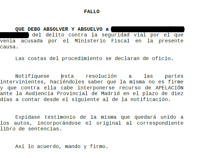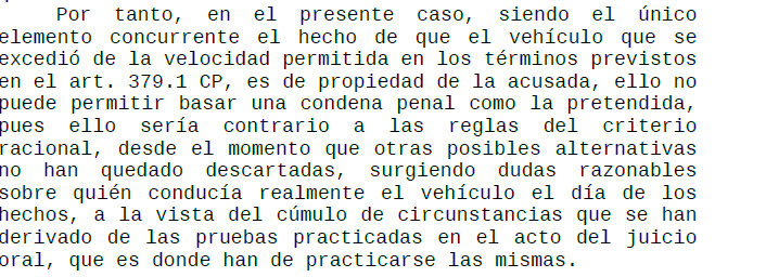 El Juez concluye que del silencio o de la falta de colaboración de nuestra clienta con la acusación no se puede derivar ninguna consecuencia negativa – a pesar de la foto de radar que demostraba que el vehículo excedió de la velocidad permitida, de la testifical de tres miembros de la guardia civil y de que el vehículo estaba a nombre de la acusada – pues sería contrario a las reglas del criterio racional y al principio de presunción de inocencia que determina que los Tribunales no han de formular un pronunciamiento condenatorio mientras no se alcance un razonable grado de certeza sobre la culpabilidad del inculpado, basada en una ponderada valoración de los medios probatorios y del principio in dubio pro reo.